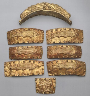 VII в. до н.э. Золото, гематит, янтарь, стеклянная паста; чеканка, пайка, ковка, выколотка, инкрустация. 16,2×32,6 см. Северо-Западный Кавказ, Закубанье, Первый Келермесский курган. Раскопки Д.Г. Шульца в 1903 г. Инв. №Ку 1903 2/1.