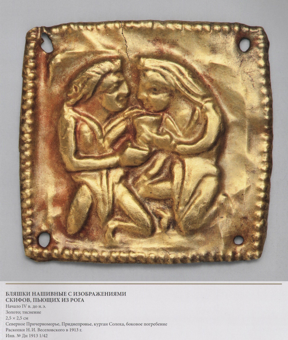 Вторая половина IV в. до н.э. Золото; басма. 9,3-9,4×8,6-8,7 см. Северное Причерноморье, Приднепровье, Александропольский курган (Луговая Могила). Раскопки А.Е. Люценко в 1856 г. Инв. №Дн 18561/16, 17.