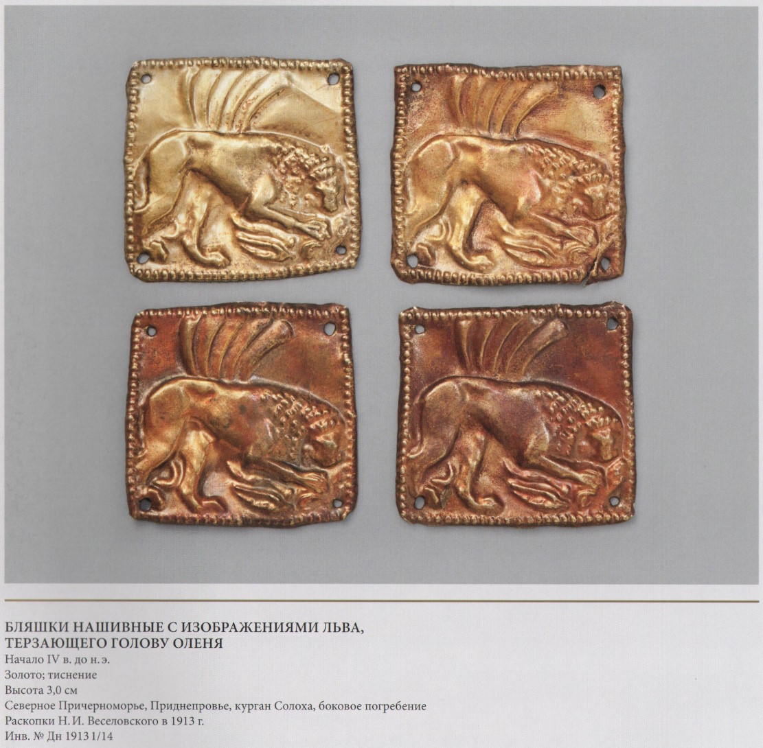 Изящные бляхи полуовальной формы были размещены на концах длинной ажурной золотой ленты с грифонами, нашитой на конский нагрудный ремень. На обеих бляхах также изображены грифоны, на одной они представлены в так называемой геральдической позе, на другой — грифон терзает длинношеего кошачьего хищника, судя по декору поверхности тела, леопарда.