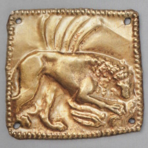 Конец VII в. до н.э. Золото; чеканка, пайка. 19,0×31,1 см. Северо-Западный Кавказ, Закубанье, Костромской (Первый Разменный) курган. Раскопки Н.И. Веселовского у станицы Костромская в 1897 г. Инв. № 2498/1. (Открыть илл. со стр. 64 в новом окне)