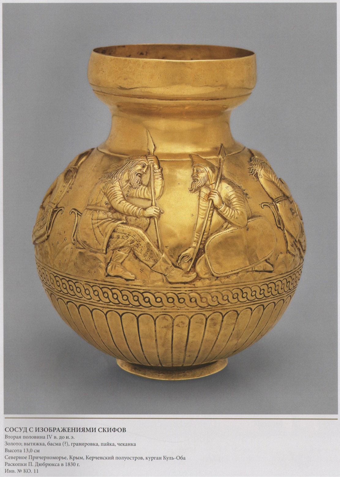 Вторая половина IV в. до н.э. Золото, вытяжка, басма (?), гравировка, пайка, чеканка. Высота 13,0 см. Северное Причерноморье, Крым, Керченский полуостров, курган Куль-Оба. Раскопки П. Дюбрюкса в 1830 г. Инв №КО.11. (Открыть илл. со стр. 192 в новом окне)