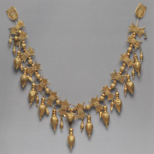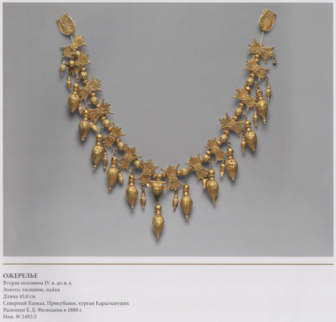 Единственное в своём роде роскошное греческое ожерелье раннеэллинистической эпохи. Здесь объёмные бусины и подвески живописно контрастируют с фигурными пластинками, отделанными тонкой филигранью. В центре — подвесной медальон в виде полой головки священного бычка с ленточкой на рогах, служившей для хранения талисмана или благовоний. Подобные женские украшения античного стиля пользовались большой популярностью у эллинизированной знати местных племён в Прикубанье.