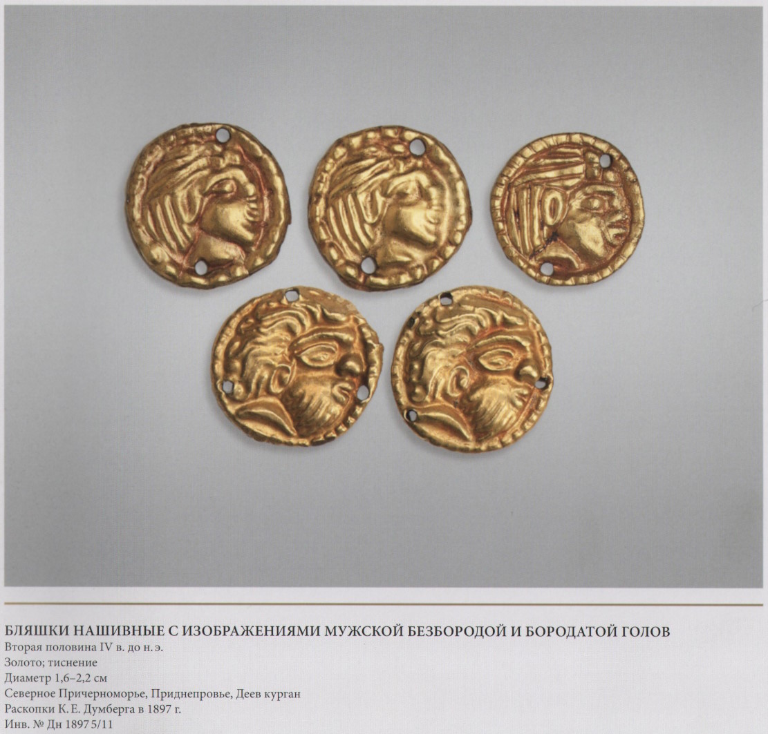 Приблизительно с 340-330-х гг. до н.э. в Скифии получает распространение специфический тип нашивных бляшек — с изображениями мужских голов как бородатых, так и безбородых. В большинстве случаев они воспроизводят, иногда довольно точно, головы бородатых или безбородых сатиров с лицевой стороны монет Боспорского царства. На Боспоре такие монеты появляются с начала IV в. до н.э., но наиболее точные соответствия скифские нашивные бляшки находят во второй половине IV в. до н.э. С каким именно персонажем скифского пантеона они в данном случае ассоциировались, и ассоциировались ли вообще, сказать затруднительно. Но значение таких находок велико ещё и потому, что при надёжном отождествлении монетного прототипа удаётся установить достаточно точно период времени, не раньше которого были изготовлены такие украшения.