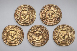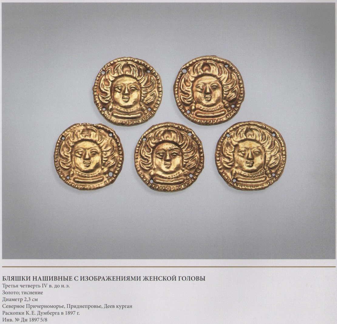 Бляшки нашивные с изображениями женской головы. ^ Третья четверть IV в. до н.э. Золото; тиснение. Диаметр 2,3 см. Северное Причерноморье, Приднепровье, Деев курган. Раскопки К.Е. Думберга в 1897 г. Инв. №Дн 18975/8.