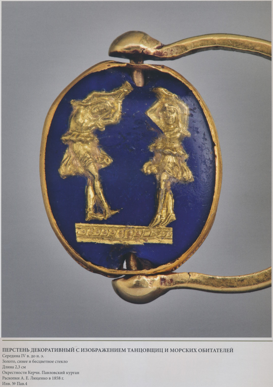 Перстень с двухсторонней стеклянной вставкой воспроизводит форму скарабеоидов-печатей, но в отличие от них его назначение чисто декоративное. Оправа щитка, украшенная филигранным орнаментом, сильно потёрта, а крепление дужки подвергалось в древности починке, что свидетельствует о длительном ношении. Плоско-выпуклая вставка состоит из пластинки синего стекла, зажатой между двумя бесцветными стёклами. На синем фоне расположены тиснёные изображения, вырезанные из фольги. На выпуклой стороне — фигурки двух танцовщиц, исполняющих окласма — танец, как считали греки, персидского происхождения. Другая фигура этого танца представлена на серьгах (с. 148). На плоской стороне — картина подводного мира: морское чудовище (по-гречески κῆτος; этим же словом назывались и китообразные, отсюда русское «кит»), дельфины и рыбы. Этот перстень представляет, по-видимому, самый ранний случай так называемого межстекольного золочения, распространившегося затем в римскую эпоху.