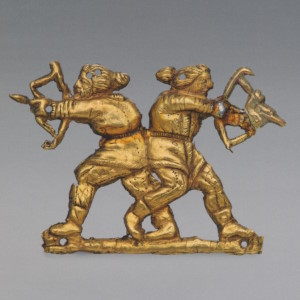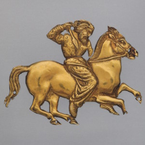 Бляшка нашивная в виде фигурки конного скифа. ^