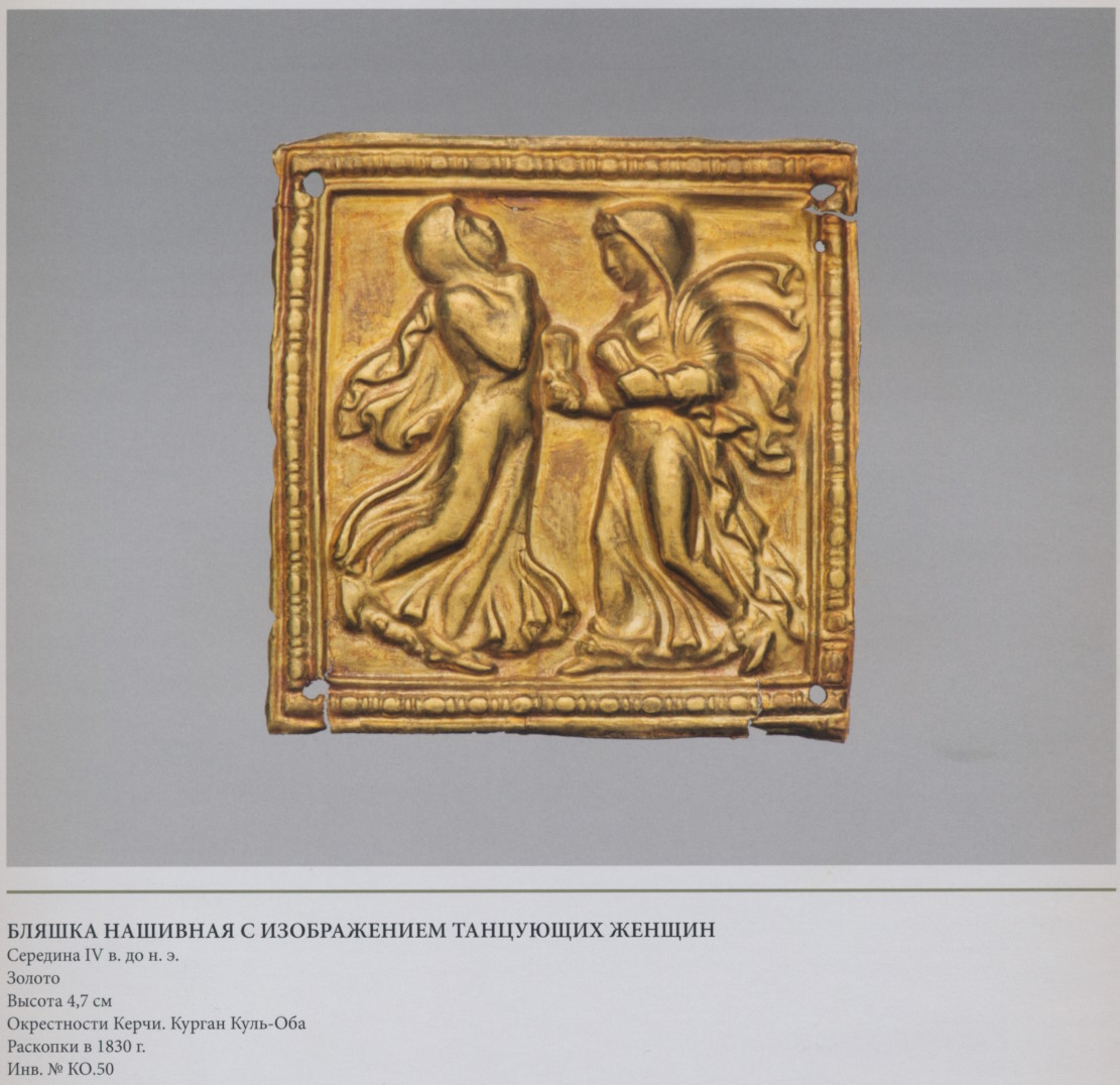 На рельефной бляшке изображены две закутанные в плащи женщины, кружащиеся в быстром танце, в руках одной из них кроталы — ударный музыкальный инструмент наподобие кастаньет. Всего найдено пять бляшек. Они вытиснены штампом столь чётко, что не потребовалось дополнительно дорабатывать «льющиеся» складки одежды танцовщиц. Одни исследователи считают их спутницами Диониса менадами (Копейкина 1986. С. 40, 41), другие — музами или харитами (Уильямс, Огден 1995. С. 150). Хариты, богини радости, часто выступали в поэзии как олицетворение юности. Афина, приближаясь к спальне Навсикаи, чтобы предсказать ей скорую свадьбу, увидела, что «подле порога дверей с двух сторон две служанки, харитам юным подобные, спали…» (Гомер. Одиссея, VI, 18, 19).
