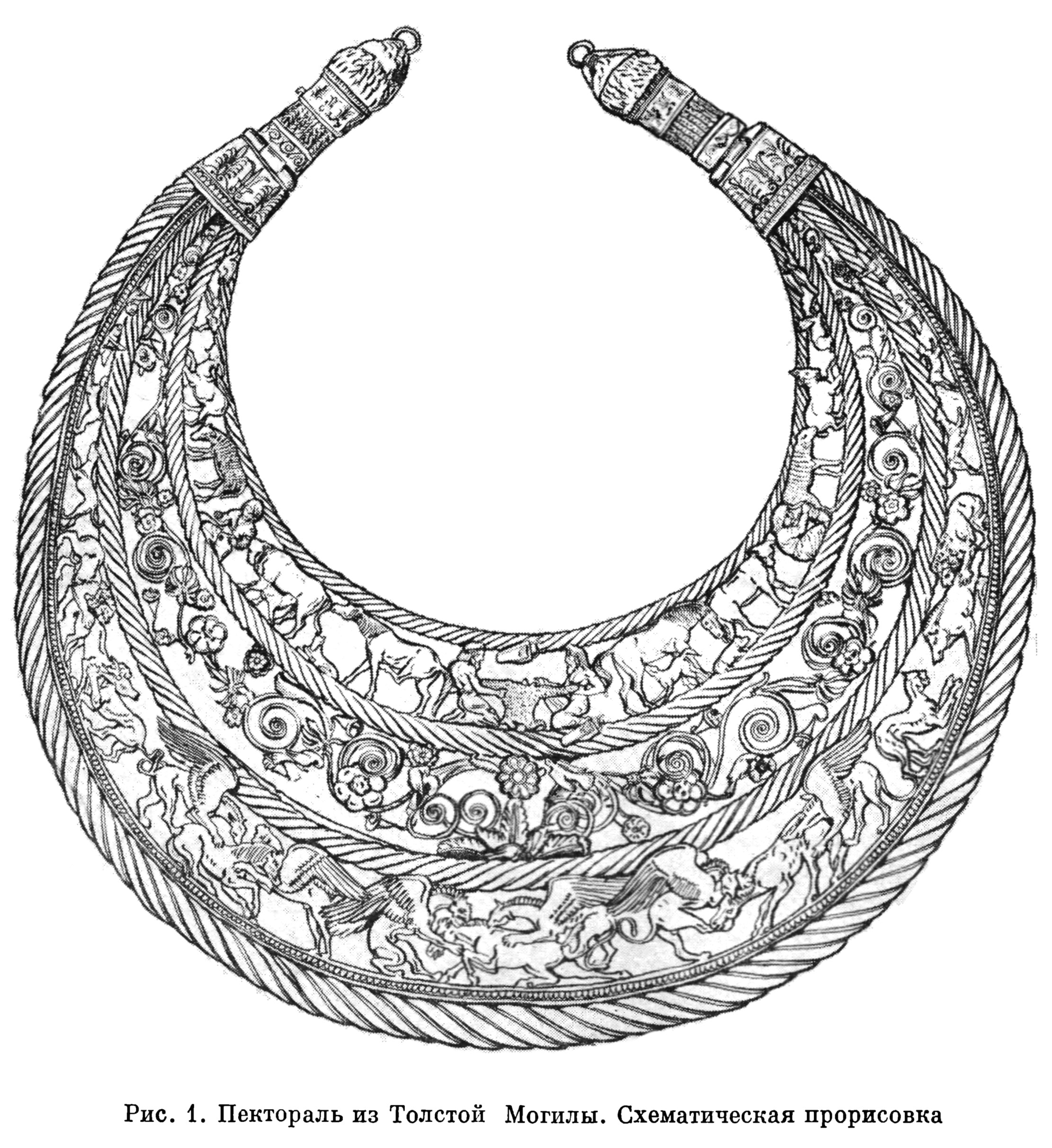 ального произведения» (рис. 1). [2] Однако значение пекторали не исчерпывается её художественными достоинствами. Не менее существенно содержание украшающих пектораль композиций, так как это ценнейший источник для постижения мировоззрения народа, памятником культуры которого пектораль является. Этой стороне изучения скифских древностей в последние годы по праву уделяется всё больше внимания. [3] В этом аспекте пектораль заслуживает специального анализа поскольку, как справедливо отметил Б.Н. Мозолевский, [4] по количеству образов она не имеет себе равных среди скифских древностей, а следовательно, объём представленной здесь «мифологической информации» является беспрецедентным. Расшифровка этого уникального по объёму из дошедших до нас скифских мифологических текстов, естественно, имела бы большое значение для изучения скифской культуры.