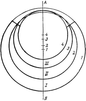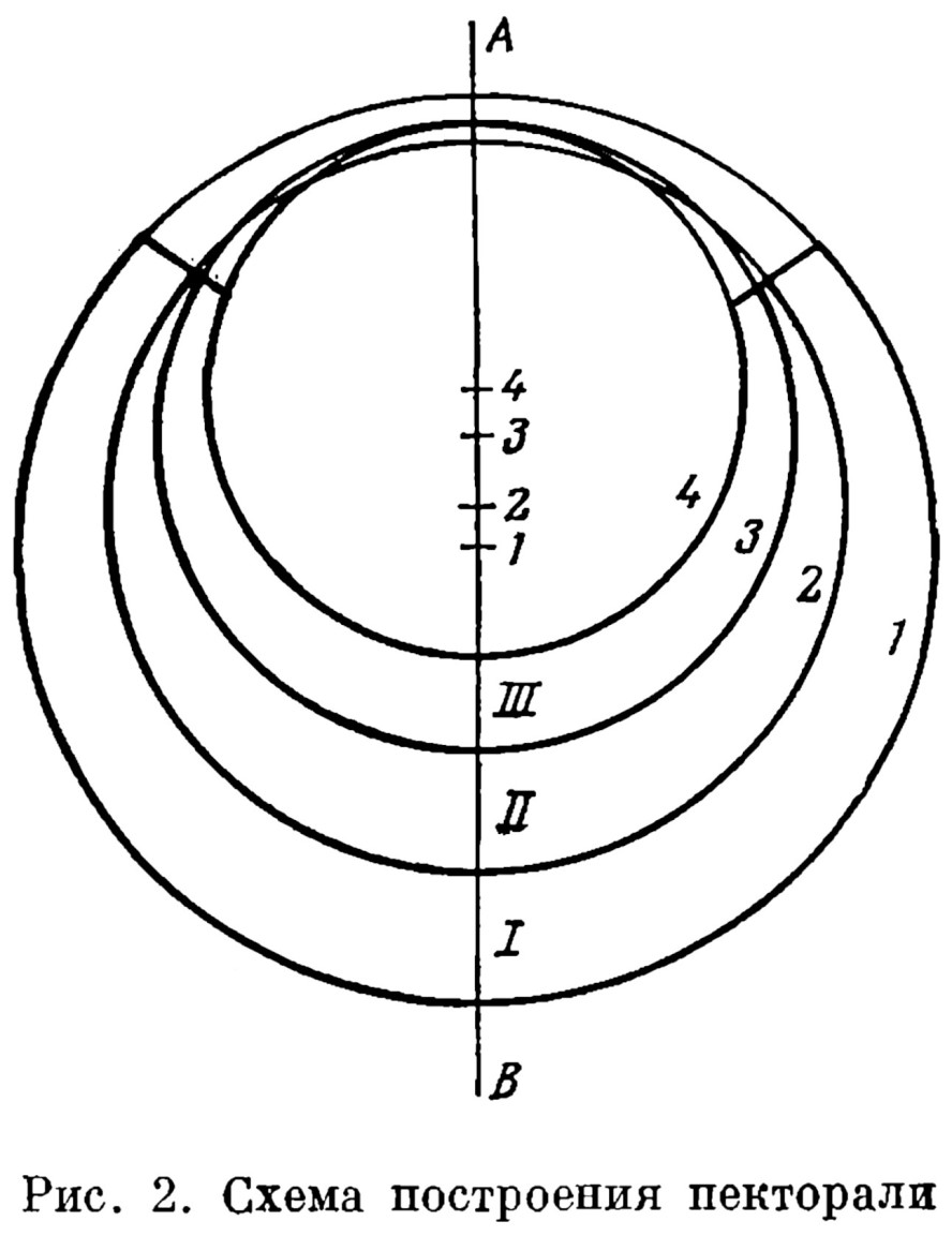 Поскольку наше толкование исходит из структуры памятника, остановимся на принципах построения композиции, украшающей пектораль (см. рис. 2). По внешнему контуру пектораль фактически представляет почти правильный круг. Ряд размещённых друг в друге эксцентрических окружностей из плетёного шнура (1-4), центры которых размещены по одной линии (AB), делит всю поверхность пекторали на три серповидные фигуры (I-III), в поле которых размещены три пояса (фриза, регистра) изображений. Линия AB, на которой находятся центры этих окружностей, является осью, относительно которой изображения каждого пояса в основном симметричны с ![]() Рис. 2. Схема построения пекторали.