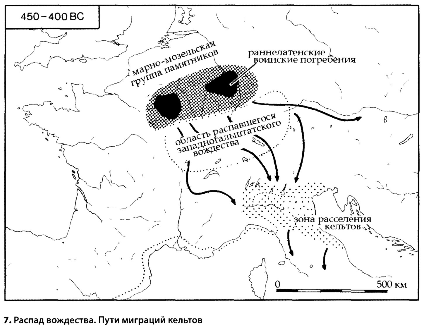 Одновременно с гибелью центров западногальштатского вождества рождается новый активный (пассионарный) военный социум с двумя центрами — в Марне и Гунсрюк-Эйфеле. В V веке до н.э. бывшая отсталая периферия стала центром культурного комплекса, известного как марно-мозельская группа западной раннелатенской культурной провинции (ил. 7).