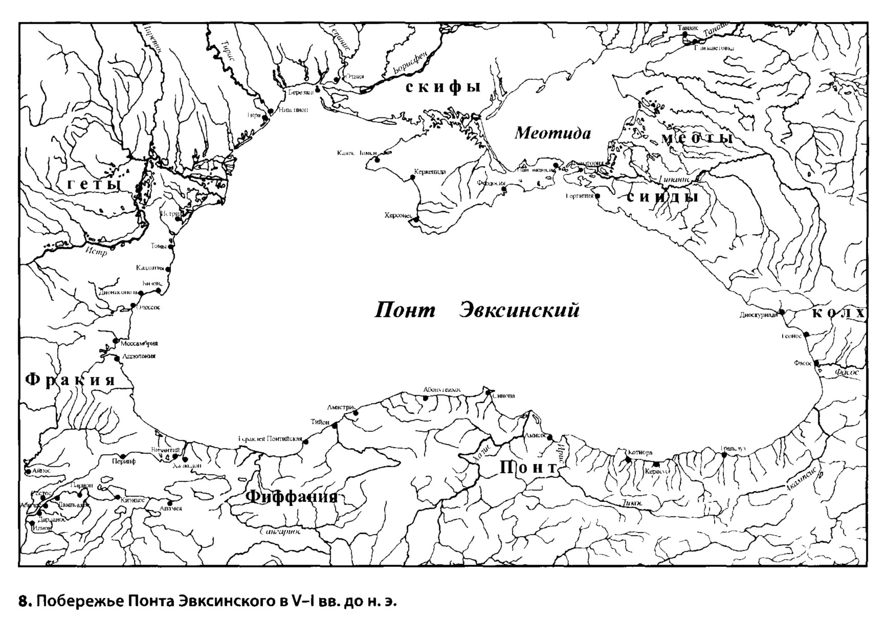 Днестровского лимана появились Тира и Никоний. В VI веке до н.э. на Керченском полуострове милетцы построили Пантикапей, возвышавшийся над Боспором Киммерийским. Интересно, что слово «Пантикапей» — этноним не греческого, а иранского происхождения и означает «рыбий путь». Это позволяет предположить, что здесь до греков находилось другое поселение — возможно, киммерийское. Впоследствии на Керченском полуострове возникли Тиритака, Нимфей, Киммерик и другие колонии. Милетцы также были основателями Феодосии. Далее их экспансия распространилась на азиатский берег Боспора, где появились Кепы, а позже — Фанагория, основанная выходцами из Теоса. Северо-восточное побережье Меотиды и Понта населяли меоты, синды, гениохи и далее — колхи, известные по мифу об аргонавтах. Так на месте современной Анапы появилась Синдская гавань, или Горгиппия, на месте Сухуми — Диоскуриада, основанная милетцами в 550-530 годах до н.э. В V веке до н.э. был заложен Херсонес Таврический, а в III веке до н.э. в результате вторичной колонизации по инициативе боспорских греков в дельте реки Дон возник Танаис, который занял место погибшего Елизаветовского городища (ил. 8).