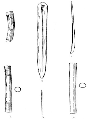1 — обломок псалия (?); 2 — лощило или кинжал; 3 — шило; 4 и 6 — игольники; 5 — игла.