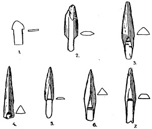 1 — бронз. кельт; 2 — бронз. кинжал; 3 — бронз. трубка; 4 — кост. наконечник стрелы.