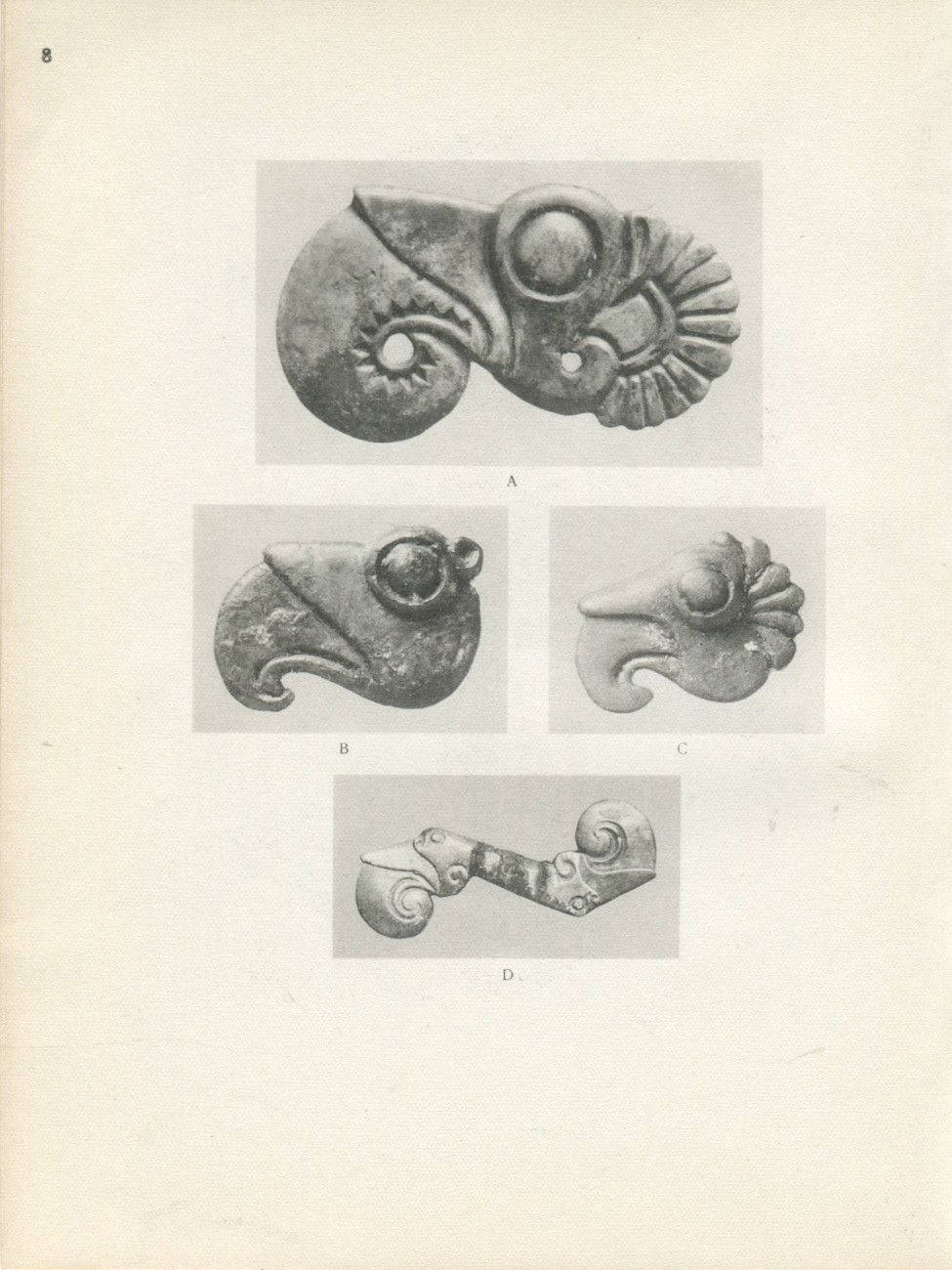 ^ Plate 8. Ornaments from horse-trappings; cast bronze. A. Kuban district, barrows of the Seven Brothers in the Kuban delta; first half of Vth century b.c.; C.R., 1876, p. 126, No. 60 text-figure; Minns, p. 209, Fig. 109. B & C. Dniepr district, Kiev Gov., near Chigirin; VIth-Vth century b.c.; C.R., 1903, p. 118; B.C.A., XIV, pp. 16-17, Fig. 39. * D. Kuban district, purchased; VIth century b.c.; Moscow Historical Museum; C.R., 1903, p. 169.