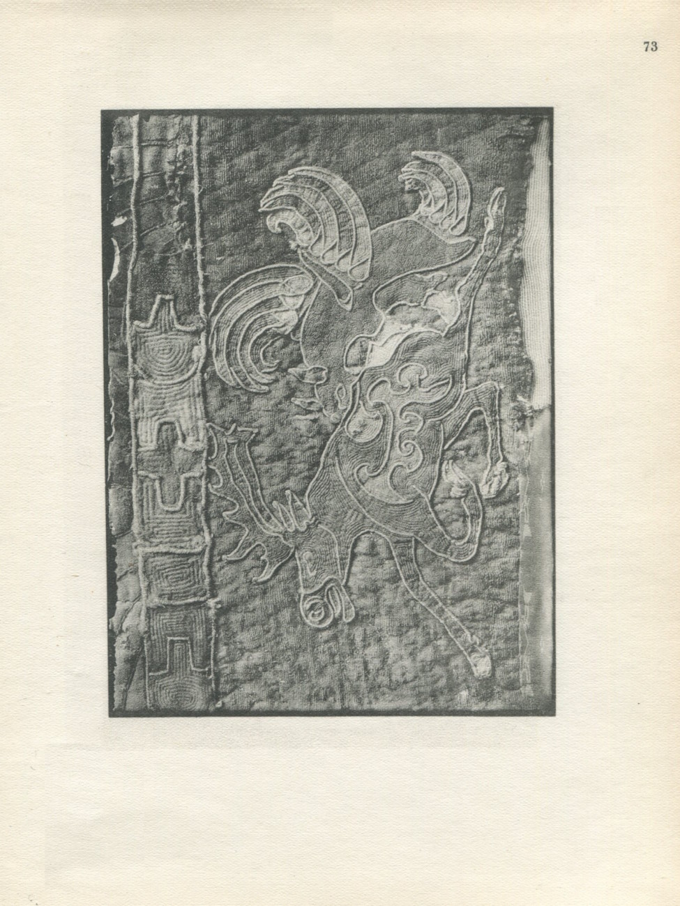 ^ Plates 73 and 74. Details of a large carpet, woven wool, with multicolour applique work in purple, brown and white. The outlines are stitched over with a cord. The scene is embroidered with various patterns; about 1/2; native Scytho-Siberian work, betraying Greek influence; found with Chinese imports of the Han period during the excavations of the Kozlov Expedition to Mongolia in 1924. Now in the Academy of Archaeology and Ethnology, Leningrad. Plate 73. Griffin and elk. Boroffka, l.c., Fig. 2, Yetts, Plate II, C. Plate 74. Yak and horned feline monster. Boroffka, l.c., Fig. 3, Yetts l.c., Plate II D. With the bronze on Plate 72 A, and the nephrite plaque on Plate 72 B, may be compared the Siberian gold plaques figured on Plate 52 A & B. There can be no doubt that the figure of the highly stylized winged dragon on the Chinese bronze and the birds’ heads of the dragon on the nephrite plaque go back to the same prototypes – the Iranian winged lion-griffin and the Greek eagle-griffin respectively — as the figures on the Siberian objects. Plate 72 B should further be compared with the Scythian and Siberian representations of the same motive exemplified on Plates 13, 14, 45, etc. The manner in which the two bezels of the jade ring are expanded in the places corresponding to the shoulders and hips demonstrates the Chinese artist’s indebtedness to Scytho-Siberian models. That the scenes of combat between beasts on the carpet from Mongolia, Plates 73 and 74, are native Scytho-Siberian work is proved by their agreement in individual motives with those on Scytho-Siberian objects. The griffin, for instance, may be compared with those on the girdle from the Kuban district (Plate 46), and on the gold plaque depicting an eagle-griffin and a yak (Plate 50). The incrustation of variegated stones on the gold is imitated on the carpet by sewing on variantly coloured threads. The striped bunches of hair on the tail and on the legs of the yak here coincide exactly in shape with those on the bronze plaque (Plate 53 A). In like manner the way in which the branches of the feline beast’s horns as well as his tail and elongated snout terminate in birds’ heads is thoroughly Siberian in style. Parallels are furnished by Plates 48 and 49 A. At the same time the plan of the scene of combat between elk and griffin and the attitude of the yak, charging head-down, are typically Greek. In Greek art such compositions were in vogue from the archaic period onwards. On the other hand, they are strange to the Scytho-Siberian animal style proper. So these fragments furnish us with convincing proof that classical Greek art had exerted its influence even in Central Asia, right to the borders of the Gobi Desert.