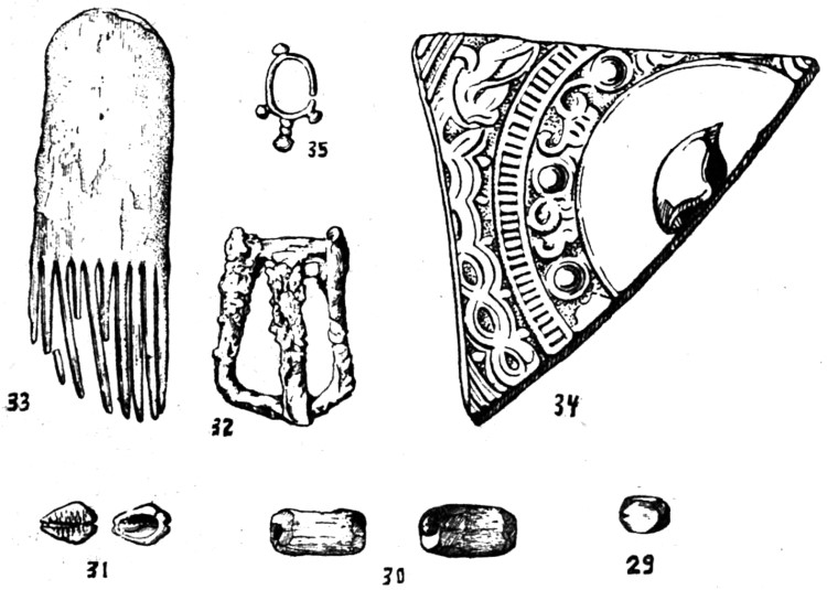 Не меньшую близость, особенно в инвентаре, мы должны отметить в погребениях курганов №№3 и 4 Туяхты. Курган №3 потревожен грабителями и поэтому в засыпи грабительского хода найдены отдельные продолговатые серебряные бляшки, повидимому от узды, и обломок костяного шарика от свистящей стрелы.