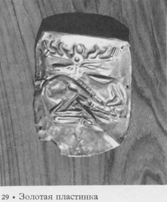 Интересны в этом отношении также фигурки козла и оленя на знаменитой диадеме сарматской жрицы из кургана «Хохлач» близ г. Новочеркасска. И хотя эти изображения, в сравнении с пазырыкским бараном, менее стилизованы, однако рога, как главный видовой признак, выделены особо. Фигурки идущих животных