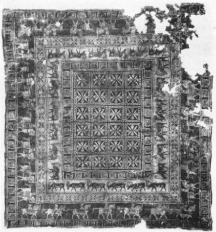 Но как выглядели великолепные переднеазиатские ковры? Об этом судить было весьма сложно. До находок на Алтае известны были только фрагменты древних узелковых ковров III-IV вв. н.э., обнаруженные при раскопках в Восточном Туркестане. Сохранившийся полностью узелковый ворсовый ковер V-IV вв. до н.э. из Пятого Пазырыкского кургана является в настоящее время древнейшим в мире и даёт представление о персидских коврах, столь знаменитых в древности.