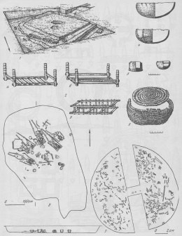 ^ Таблица 7. Чирикрабатская культура. Погребальные памятники, находки из дерева.1 — план культового комплекса Бабиш-Мулла 6; 2 — деревянные погребальные носилки из мавзолея Асар; 3 — Баланды 4; 4-6 — деревянные сосуды, корзина из мавзолея Асар; 7 — план заполнения мавзолея Асар.(Открыть Табл. 7 в новом окне)