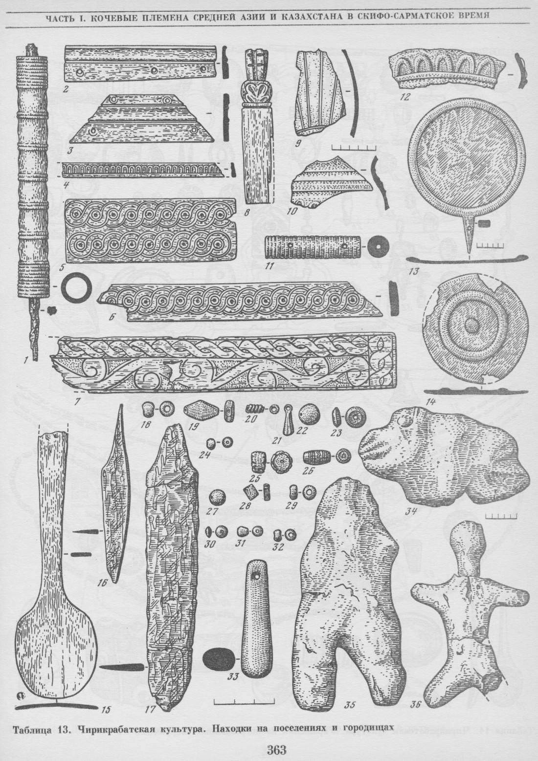 ^ Таблица 13. Чирикрабатская культура. Находки на поселениях и городищах.1 — Баланды 2; 2-13, 34 — городище Баланды 1; 14-17, 32, 33 — городище Бабиш-Мулла 1; 18-31, 36 — поселения; 35 — городище Чирик-Рабат; 1-8, 11, 15 — кость; 9, 10, 18-21, 27, 29-32 — стекло; 12 — серебро; 13, 14 — бронза; 16, 17 — железо; 22, 26 — сердолик; 23 — стекло с позолотой; 24 — гагат; 25, 33, 34 — камень: 28 — пирит чёрный; 35, 36 — глина.(Открыть Табл. 13 в новом окне)