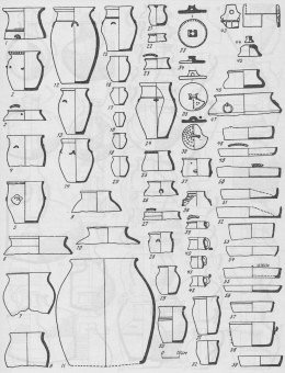 ^ Таблица 10. Чирикрабатская культура. Керамика первой группы.1-17, 33, 34, 54, 74, 75, 99 — погребальные сооружения; 18-32, 35-53, 55-73, 76-98 — поселения, городища.(Открыть Табл. 10 в новом окне)