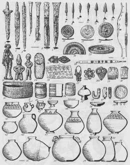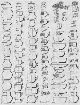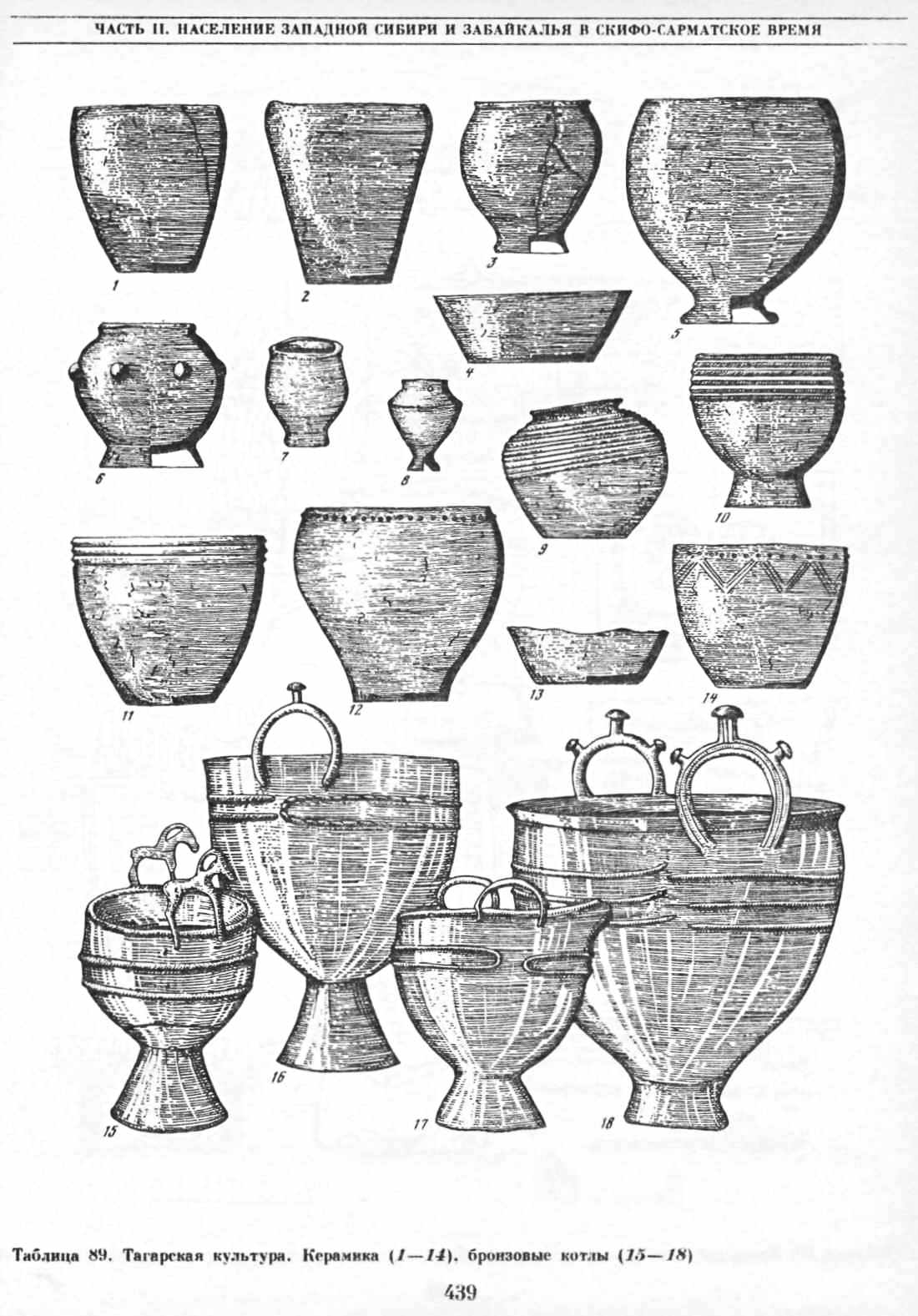 ^ Таблица 89. Тагарская культура. Керамика (1-14). бронзовые котлы (15-18).1-5 — керамика V-III вв. до н.э.: 1 — Копьёва, 2, 3 — Сарагаш, 4 — Усть-Тесь, 5 — Малая Иня; 6-14 — керамика VII-VI вв. до н.э.: 6 — оз. Шира, 7, 8 — Страшный Лог, 9 — Откнин улус, 10 — Батени, 11 — Усть-Тесь, 12-14 — Тесь; 15-18 — Минусинский край.(Открыть Табл. 89 в новом окне)