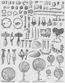 ^ Таблица 87. Тагарская культура. Украшения и предметы туалета.1, 4, 13, 14 — гребни: 1 — Кара-кургэн, 4 — Самохвал, 13 — Сыда, 14 — станция Минусинск; 2, 5, 9-12 — бусы: 2, 11 — Кочергино; 5, 9, 10, 12 — Откннн улус; 3, 7, 8 — пронизки: 3 — Откнин улус, 7, 8 — Кочергино; 6 — серьга; 15-18 — бляшки-украшения головного убора: 6, 15, 17 — Откнин улус, 16 — Тагарский остров, 18 — станция Минусинск; 19, 20, 22 — туалетные ножи: 19 — Кызыл-Куль, 20 — Усть-Тесь, 22 — Сыда; 21 — привеска из клыка кабарги (Откнин улус); 23-25 — зеркала: 23 — гора Изых, 24 — Откннн улус, 25 — Бедра; 1, 4, 13, 14, 19, 20, 22 — кость; 2 — аргиллит; 5, 9 — сердолик; 6 — бронза и золото; 21 — клык кабарги; остальное — бронза.(Открыть Табл. 87 в новом окне)