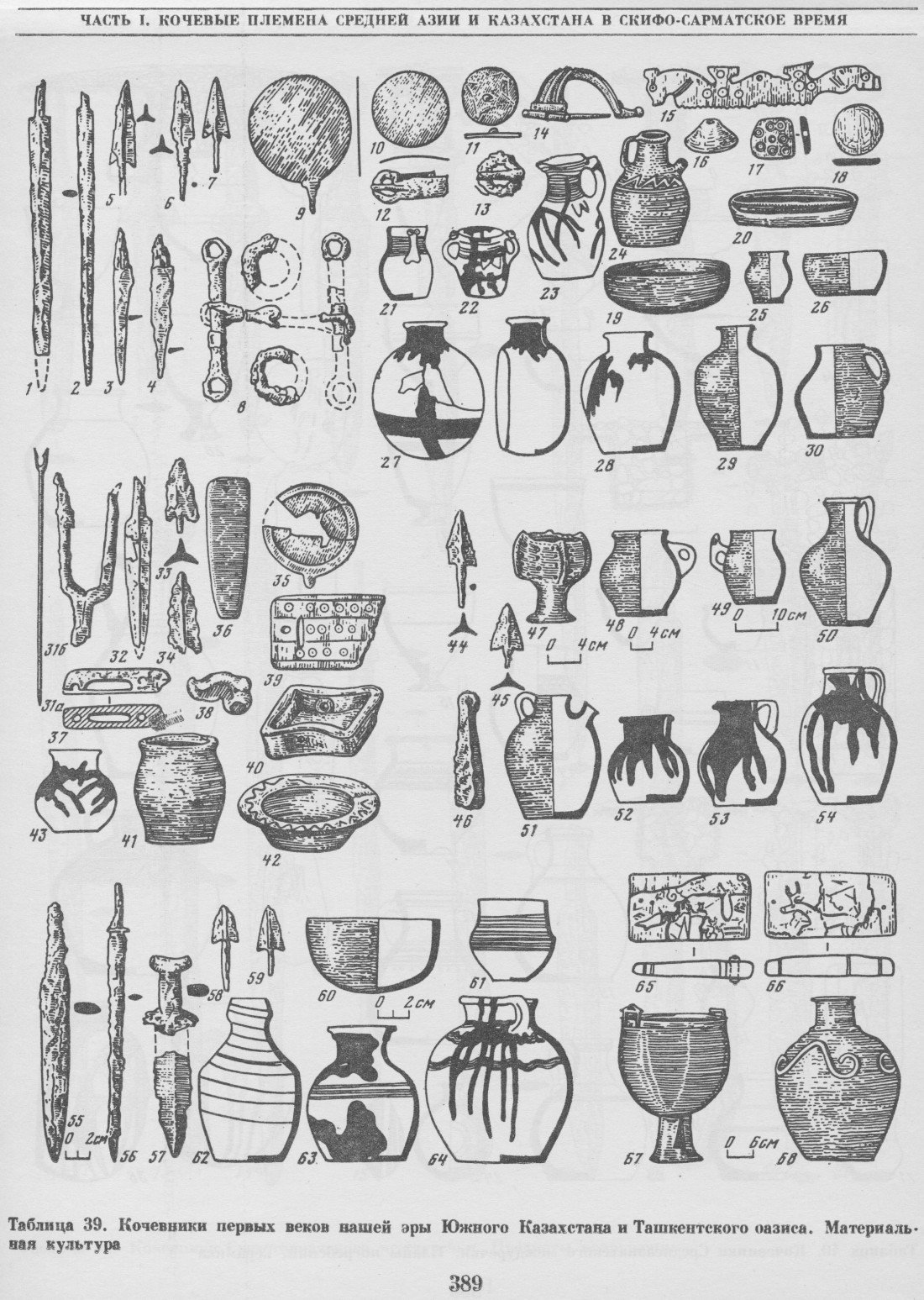 ^ Таблица 39. Кочевники первых веков нашей эры Южного Казахстана и Ташкентского оазиса. Материальная культура.1-13, 16-30 — Шаушукум (катакомбы типа I); 14, 15 — Янгиюль; 31-36, 39-43 — Шаушукум (катакомбы типа II); 38, 65-68 — Жаман-Тогай; 44-47, 52-54 — Шаушукум (подбои); 48-51 — Куль-Ата; 55-64 — Шаушукум (грунтовые могилы); 1-8, 12, 13, 31-34, 44-46, 55-59 — железо; 9-11, 19, 35, 67 — бронза; 14 — серебро; 15, 17, 18, 39, 65, 66 — кость; 16, 20-30, 40-43, 47-54, 60-64, 68 — глина; 36, 37 — камень.(Открыть Табл. 39 в новом окне)