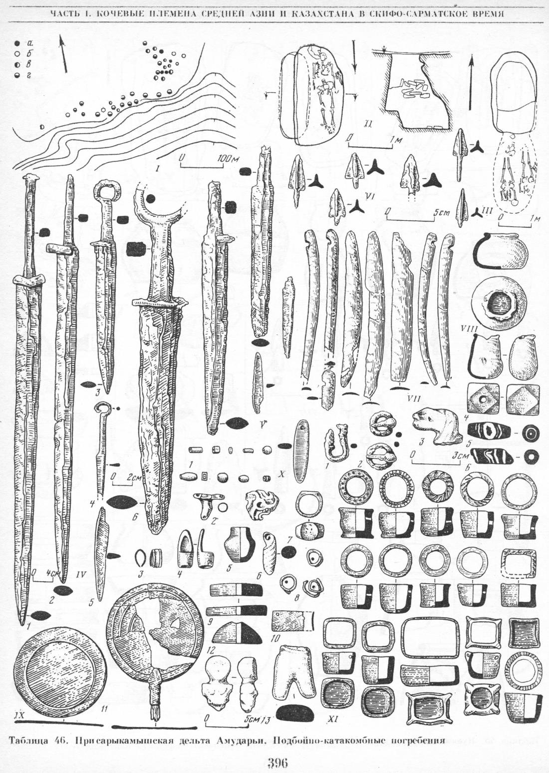 ^ Таблица 46. Присарыкамышская дельта Амударьи. Подбойно-катакомбные погребения.I, VI, VII, X, XI — Тузгыр, юго-западная группа: I — план (а — грунтовые погребения; б — нераскопанные курганы; в — курганы с подбоями; г — курганы с катакомбами); VI, VII, X. XI — инвентарь: VI — железо; VII — кость; X — камень; XI, 1, 2 — железо; XI, 3 — раковина; XI, 4, 6 — стекло; остальное — глина; II, IX — Тумек-кичиджик; II — курган 49; IX — инвентарь: 1 — стекло; 2, 3, 7, 8, 10, 11 — бронза, 4 — кость, 5, 9, 12 — глина, 6 — раковина, 13 — алебастр; III, V, VIII — Тузгыр: III — курган 22; V — курганы 17, 21 (железо); VIII — курганы 8 и 23 (алебастр); IV — мечи из погребений: IV, 1, 5, 6 — Тумеккичиджик: 1 — курган 63; 5, 6 — курган 49; IV, 2, 3 — Гяур 4: 2 — курган 6, 3 — курган 1: IV, 4 — курган на возвышенности Гяургыр.(Открыть Табл. 46 в новом окне)