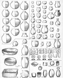 ^ Таблица 49. Северо-западная Туркмения, второй этап культуры скотоводов (II в. до н.э. — IV в. н.э.). Инвентарь из погребальных сооружений.I, II — лепная керамика; III-XI — импортная гончарная керамика; XII, XIII — оссуарии из могильника Дордуль; XIV — статуэтки; XV — пряслица; XVI, XVIII — курильницы; XVII — сосудики из погребальных сооружении Дордуля; XIII, XVII — алебастр; XIV — гипс; остальное — глина.(Открыть Табл. 49 в новом окне)
