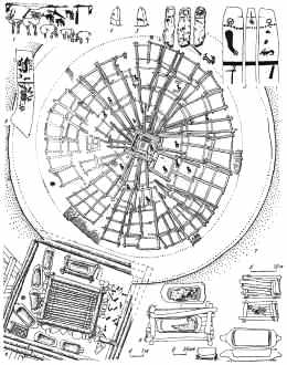 ^ Таблица 90. Тагарская культура. Погребальный обряд.1 — вид на могильник Кулун II; 2 — вид на могильник Изыкчуль; 3 — вид Большого Салбыкского кургана в процессе раскопок; 4-9 — могильник Барсучиха V; 4, 5 — план и разрез ограды, 6-8 — план и разрез могил; 10, 11 — могильник Тепсей IX, курган 2; 12-17 — могильник Туран II: курган 5; 12-15 — план, разрез, стены оградки, 16, 17 — план и разрез могилы 2; 18, 19 — могильник Туран II. план и разрез могилы 4 кургана 4.(Открыть Табл. 90 в новом окне)