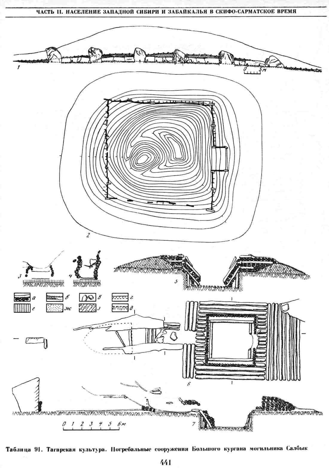 ^ Таблица 91. Тагарская культура. Погребальные сооружения Большого кургана могильника Салбык.1 — северная стена ограды Большого кургана; 2 — план ограды Большого кургана; 3-5, 7 — разрезы бревенчатого склепа и дромоса в Большом Кургане; 6 — план бревенчатого склепа в Большом кургане: а — брёвна; б — берёста; в — камни; г — погребённая почва; д — материк; е — тёмная почва; ж — красная глина; з — выброс из могильной ямы.(Открыть Табл. 91 в новом окне)