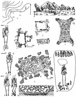 ^ Таблица 51. Тасмолинская культура. Погребальные сооружения.1 — Тасмола I, курган 19; 2 — Карамурун I, курган 10; 3 — Карамурун I, группа 5; 4 — Карамурун I; 5 — основные типы курганов с каменными грядами (а — скелет или отдельные кости лошади; б — глиняный сосуд); 6 — Кара-Бие, курган 15; 7 — Тасмола V, курган 3; 8 — Айдабуль II, курган 1; 9 — Карамурун I, курган 5ж; 10 — Киик-Су, курган 5; 11 — Тасмола II, курган 1; 12 — Нурманбет IV. курган 1.(Открыть Табл. 51 в новом окне)