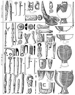 ^ Таблица 50. Северо-западная Туркмения. Инвентарь из погребальных сооружений и святилища Ичянлыдеие.I — погребальное сооружение в 25 м к югу от Чарышлы; II-IV, VI, VII — Дордуль, сооружение 10; V — Назар-калы; VIII — Ялкым, сооружение 1; IX — Ичянлыдепе, X, XII, XIII, XVIII — Балашпем: X — сооружение 10, XII, XVIII — сооружение 3, XIII — сооружения 3, 4; XI — Бегиарслан, сооружение 2; XIV-XVI — Ханалы: XIV, XV — сооружение 10, XVI — сооружение 8; XVII — погребальные сооружения верхнего Узбоя; XIX — Ялкым. сооружение 5; XX — Гичгельды, погребальные сооружения; I, 1-3, II, IV, XIII-XV — железо; 1, 4 — камень; III, VI-XII, XVII (а), XX (б) — бронза; V — египетский фаянс; XVI, XVII, XX (а) — стекло; XVIII — кость; XIX — стеклянная паста.(Открыть Табл. 50 в новом окне)