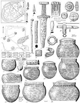 ^ Таблица 117. Лесостепное Притоболье. Памятники воробьёвского типа.1, 5 — планы жилищ; 2 — план городища; 3, 4, 6-23 — инвентарь; 1, 6-9, 17, 19, 21 — Речкино I; 2, 11 — Воробьёвское; 3 — Речкино II; 4, 10, 16, 23 — Шадринский; 5 — Боровое; 12-14 — Носиловское II; 15 — б. Шадринский уезд; 18, 20 — Язево I; 22 — Камышное II; 3, 4, 10, 15 — бронза; 6-9, 12-14, 17-23 — глина; 11 — железо; 16 — тальк.(Открыть Табл. 117 в новом окне)