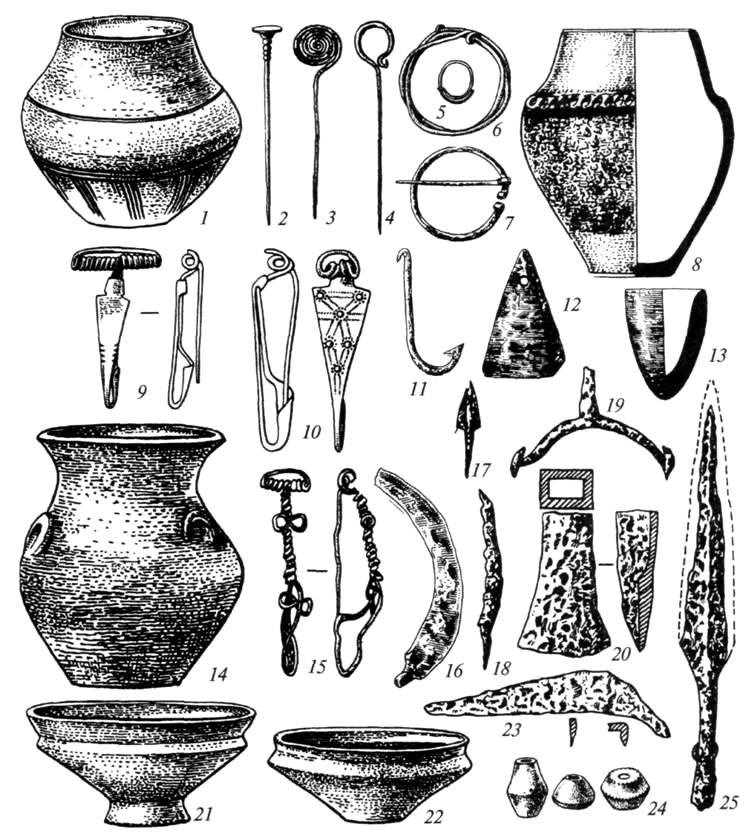 1, 8, 14, 21, 22 — керамические сосуды; 2-4 — бронзовые булавки; 5 — бронзовое височное кольцо; 6 — бронзовый браслет; 7 — бронзовая пряжка; 9, 10, 15 — бронзовые фибулы; 11 — железный рыболовный крючок; 12 — глиняное грузило; 13 — керамический тигель; 16 — железный серп; 17 — железный черешковый наконечник стрелы; 18 — железный нож; 19 — железная шпора; 20 — железный топор-«кельт»; 23 — железная коса; 24 — керамические пряслица; 25 — железный наконечник копья.