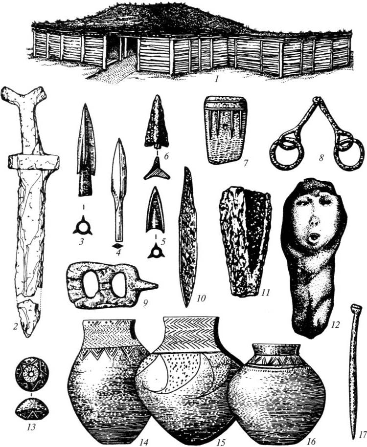 1 — реконструкция двухкамерного жилища каркасно-столбовой конструкции; 2 — железный кинжал; 3, 5 — бронзовые втульчатые наконечники стрел; 4 — костяной черешковый наконечник стрелы; 6 — железный черешковый наконечник стрелы; 7 — бронзовый «кельт»; 8 — железные удила с кольцами; 9 — костяная пряжка; 10 — железный нож; 11 — железный кельт-мотыга; 12 — глиняная антропоморфная фигурка; 13 — глиняное пряслице; 14-16 — керамические сосуды; 17 — костяная проколка.