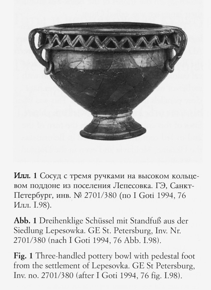 Илл. 1. Сосуд с тремя ручками на высоком кольцевом поддоне из поселения Лепесовка. ГЭ, Санкт-Петербург, инв. №2701/380 (по I Goti 1994, 76 Илл. I.98).Abb. 1. Dreihenklige Schüssel mit Standfuß aus der Siedlung Lepesowka. GE St.Petersburg, Inv. Nr. 2701/380 (nach I Goti 1994, 76 Abb. I.98).Fig. 1. Three-handled pottery bowl with pedestal foot from the settlement of Lepesovka. GE St Petersburg, Inv.no. 2701/380 (after I Goti 1994, 76 fig. I.98).(Открыть Рис. 1 в новом окне) |
