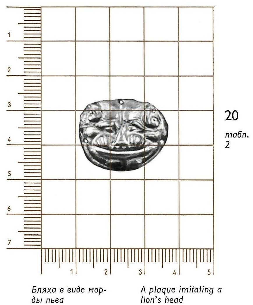 ^ 20. Бляха в виде морды льва [стр. 25].(Открыть в новом окне)20. A plaque imitating a lion’s head. |