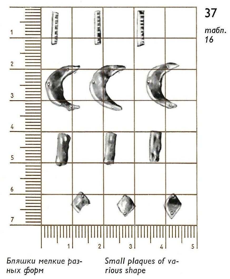 ^ 16. Бляшки мелкие разных форм и размеров. Золото [стр. 98].(Открыть Табл. 16 в новом окне)16. Small plaques of different size and shape; gold. |
