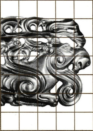 ^ 33. Бляха в виде головы тигра анфас между вертикальными планками [стр. 29].(Открыть в новом окне)33. A plaque picturing a tiger’s head (front view) between vertical bars. |