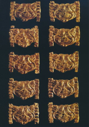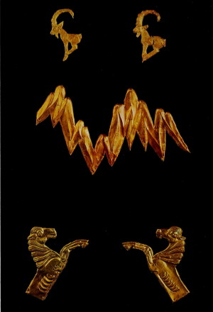 ^ 9. Протомы крылатых коней с рогами горного козла — украшение налобной части головного убора. Круглая скульптура. Основа — дерево,обкладка — из листового золота 10×17,5 см [стр. 18-19].(Открыть в новом окне)9. Protomes of winged horses with horns of a mountain goat, a decoration of the front part of a head-gear; round sculpture; gold-coated wood, 10 cm ×17.5 cm. |