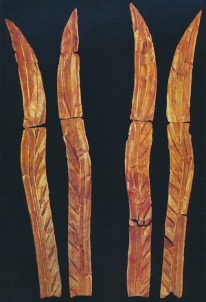 ^ 7. Стреловидные украшения. Основа — дерево, наконечники и ленты-спирали — из золота. 38-40×2 [стр. 90].(Открыть Табл. 7 в новом окне)7. Arrow-shaped decorations with wooden shafts, golden tips and golden spiraled strips; 38-40×2. |