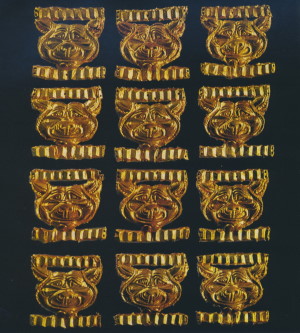 ^ 4. Бляхи в виде барсов с зубчатыми пластинами, изображающими горы. Барельеф. Золото. 7,2×8.