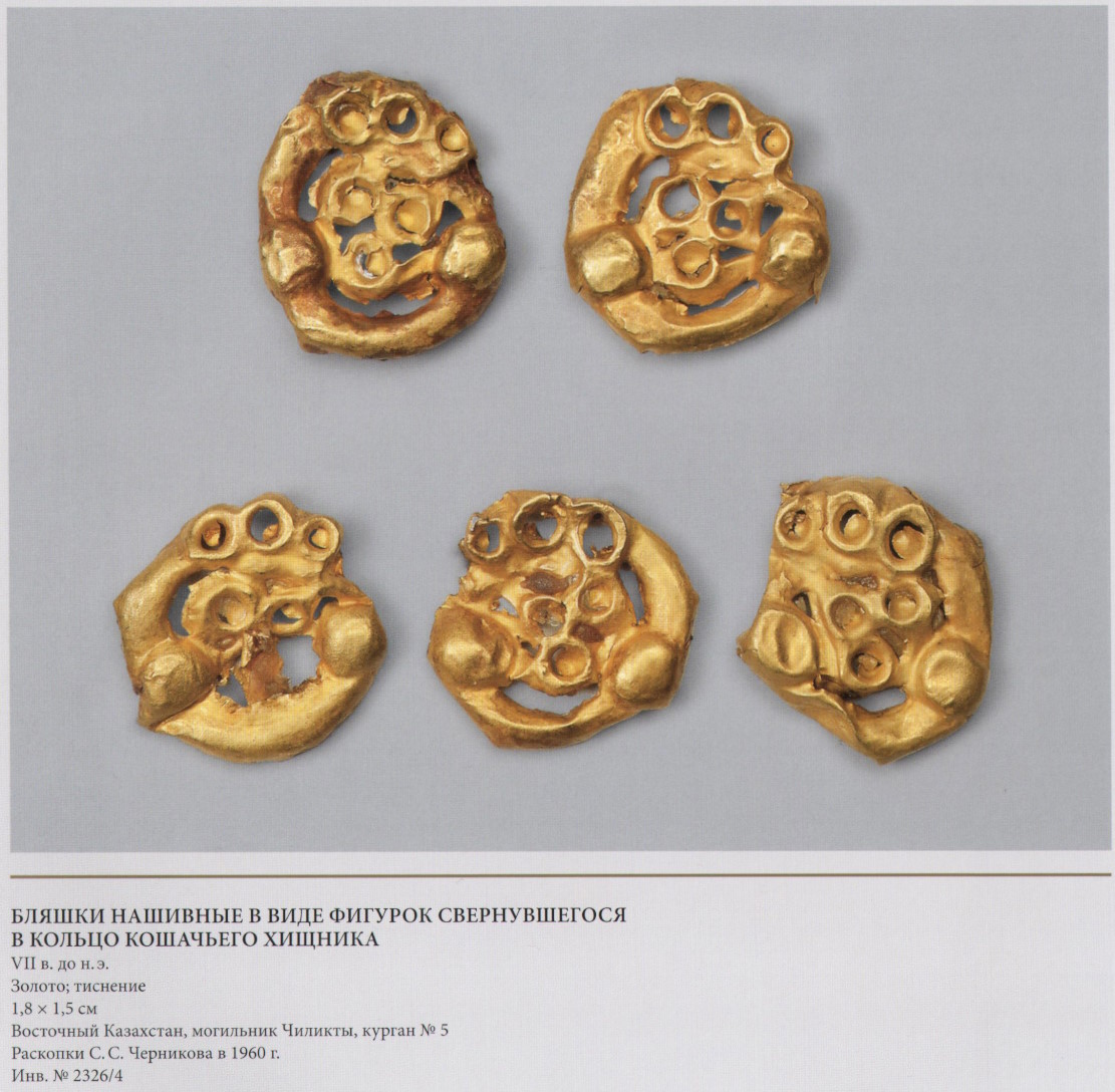 VII в. до н.э. Золото; вырезаны из тонкого листа. 3,0×5,0 см. Восточный Казахстан, могильник Чиликты, курган №5. Раскопки С.С. Черникова в 1960 г. Инв. №2326/2. (Открыть илл. со стр. 53 в новом окне)