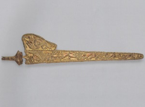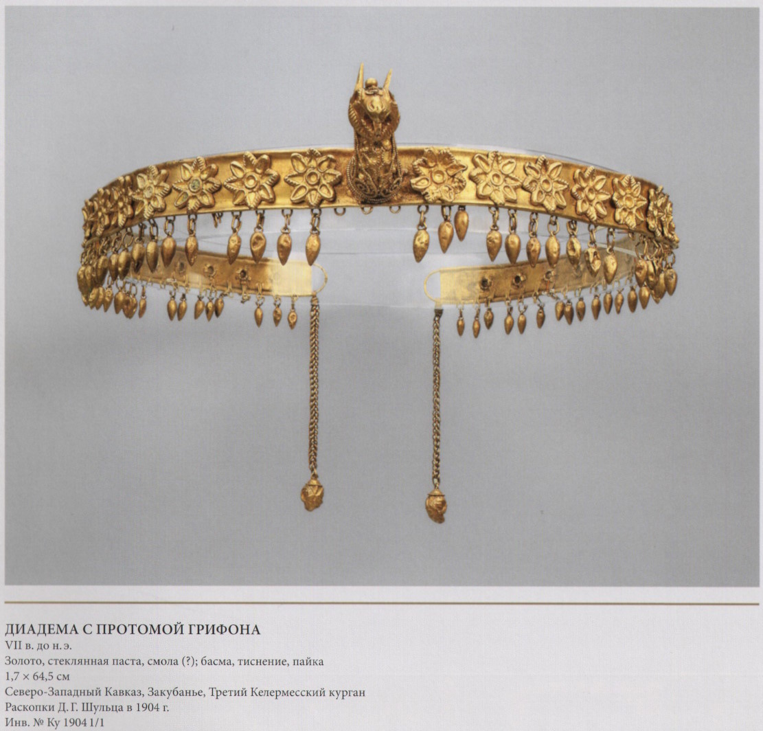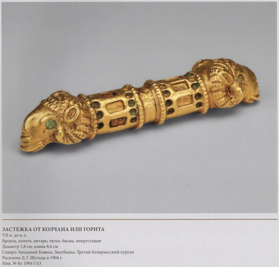 VII в. до н.э. Золото, гематит, янтарь, стеклянная паста; чеканка, пайка, ковка, выколотка, инкрустация. 16,2×32,6 см. Северо-Западный Кавказ, Закубанье, Первый Келермесский курган. Раскопки Д.Г. Шульца в 1903 г. Инв. №Ку 1903 2/1.
