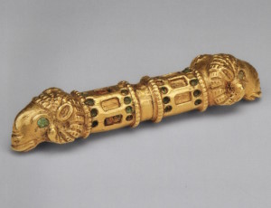 Это украшение, имеющее пару, по характеру изображений львиных и бараньих голов, плодов растения (то ли граната, то ли опийного мака) можно отнести к изделиям ассирийского мастера. В литературе их часто называют ручками трона, хотя в действительности назначение изделий остается неясным. Высказаны предположения, что они могли служить оформлением основания статуи или быть составной частью предмета, похожего на урартские канделябры. Скифы приспособили эти вещи для собственных нужд, о чем свидетельствуют грубые вырезы на дне.