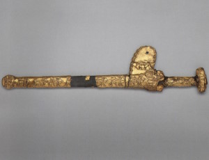 Меч с золотой рукоятью был обнаружен в одной из ниш основного погребального сооружения. В настоящее время не может быть сомнений в древнеиранском характере орнаментальных мотивов, композиций, стилистических особенностей его изображений. По форме рукояти и многочисленным аналогиям в ахеменидском изобразительном искусстве (Сузы, Персеполь, Амударьинский клад) можно предположить, что она была изготовлена в V в. до н.э. Отдельные мотивы, связывающие рукоять меча с искусством мидийской эпохи, такой датировке не противоречат. В Скифии в IV в. до н.э. был изготовлен новый железный клинок для ножен с изображениями батальных сцен.