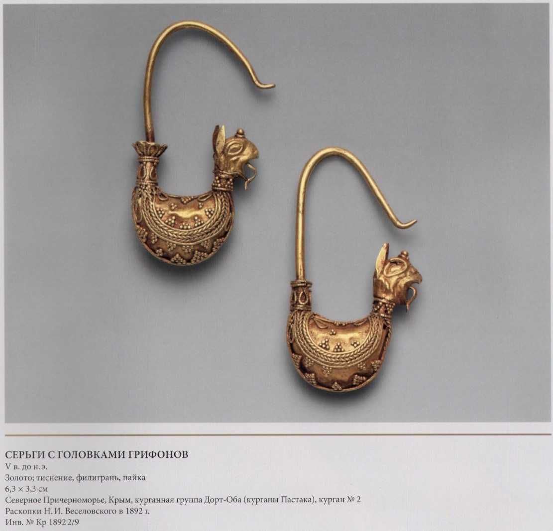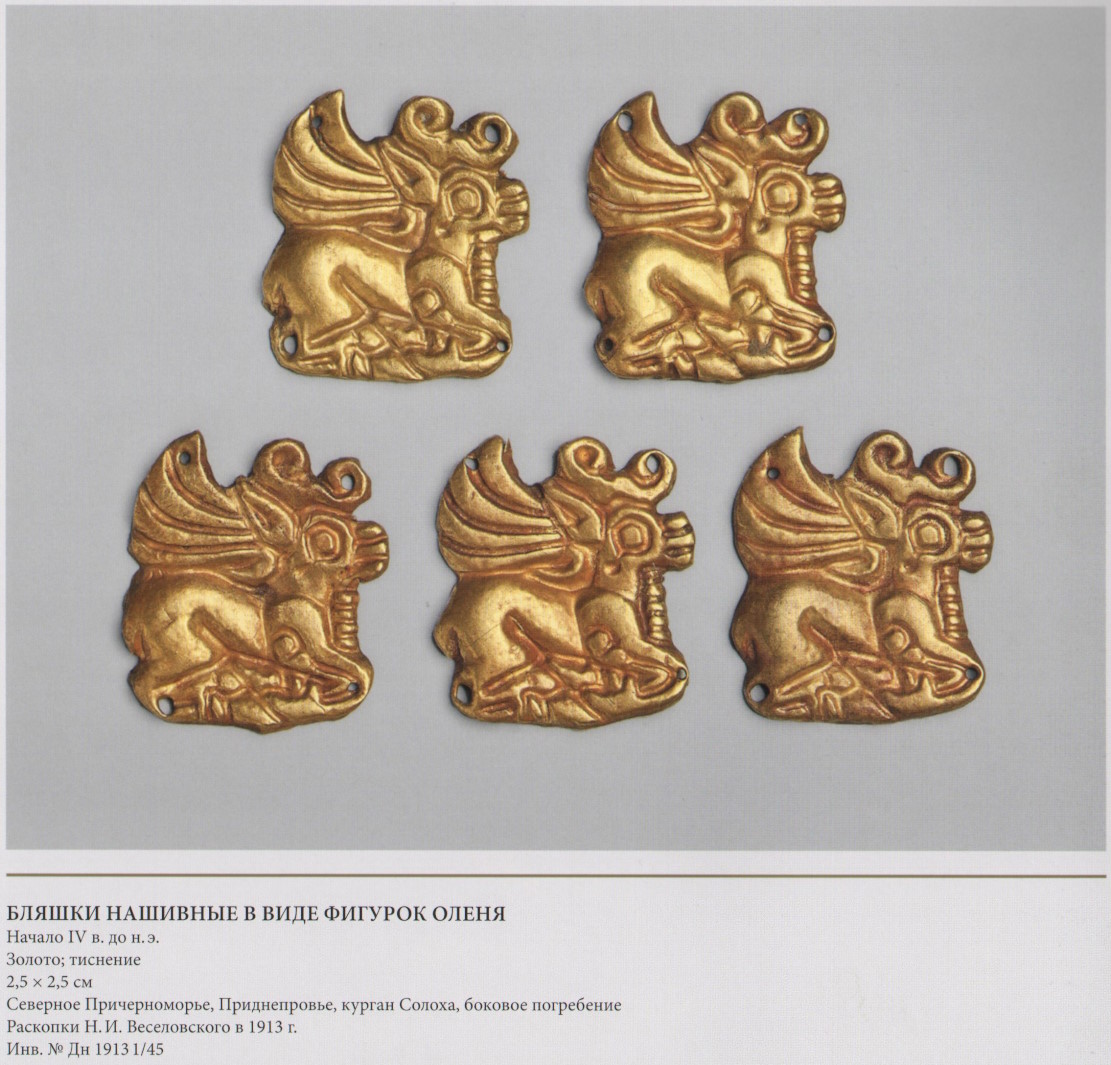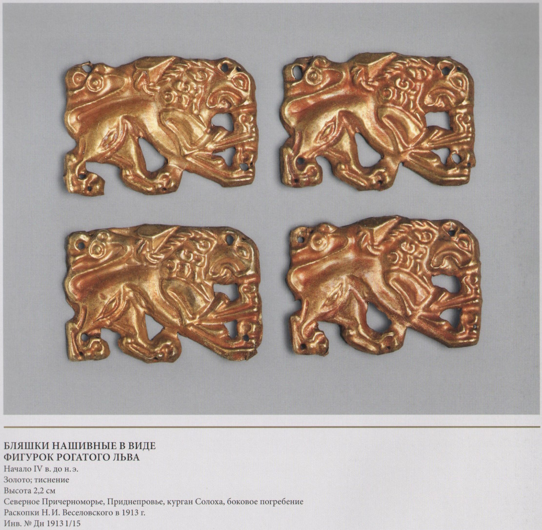 Изящные бляхи полуовальной формы были размещены на концах длинной ажурной золотой ленты с грифонами, нашитой на конский нагрудный ремень. На обеих бляхах также изображены грифоны, на одной они представлены в так называемой геральдической позе, на другой — грифон терзает длинношеего кошачьего хищника, судя по декору поверхности тела, леопарда.