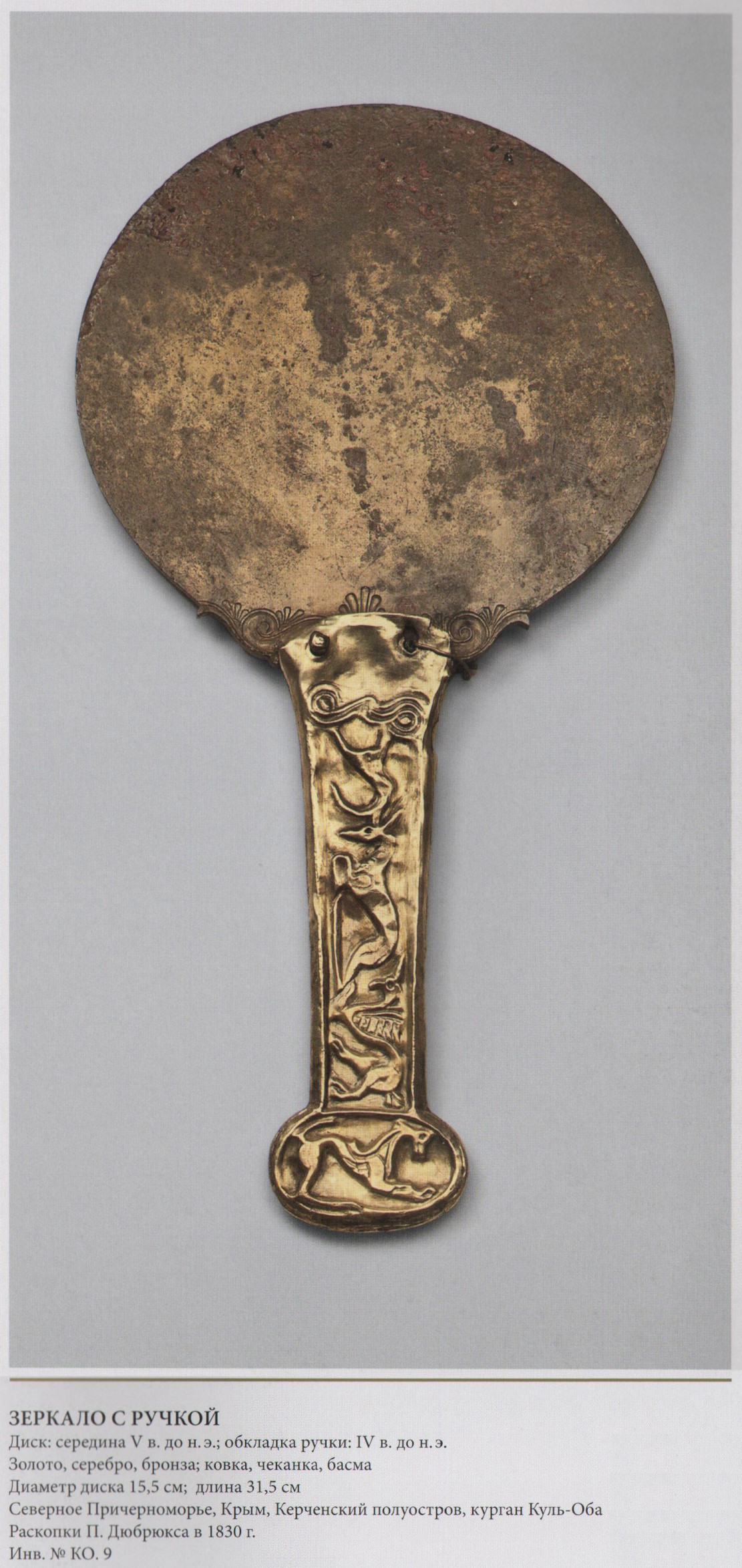 Диск: середина V в. до н.э.; обкладка ручки: IV в. до н.э. Золото, серебро, бронза, ковка, чеканка, басма. Диаметр диска 15,5 см; длина 31,5 см. Северное Причерноморье, Крым, Керченский полуостров, курган Куль-Оба. Раскопки П. Дюбрюкса в 1830 г. Инв. №КО.9. (Открыть илл. со стр. 177 в новом окне)